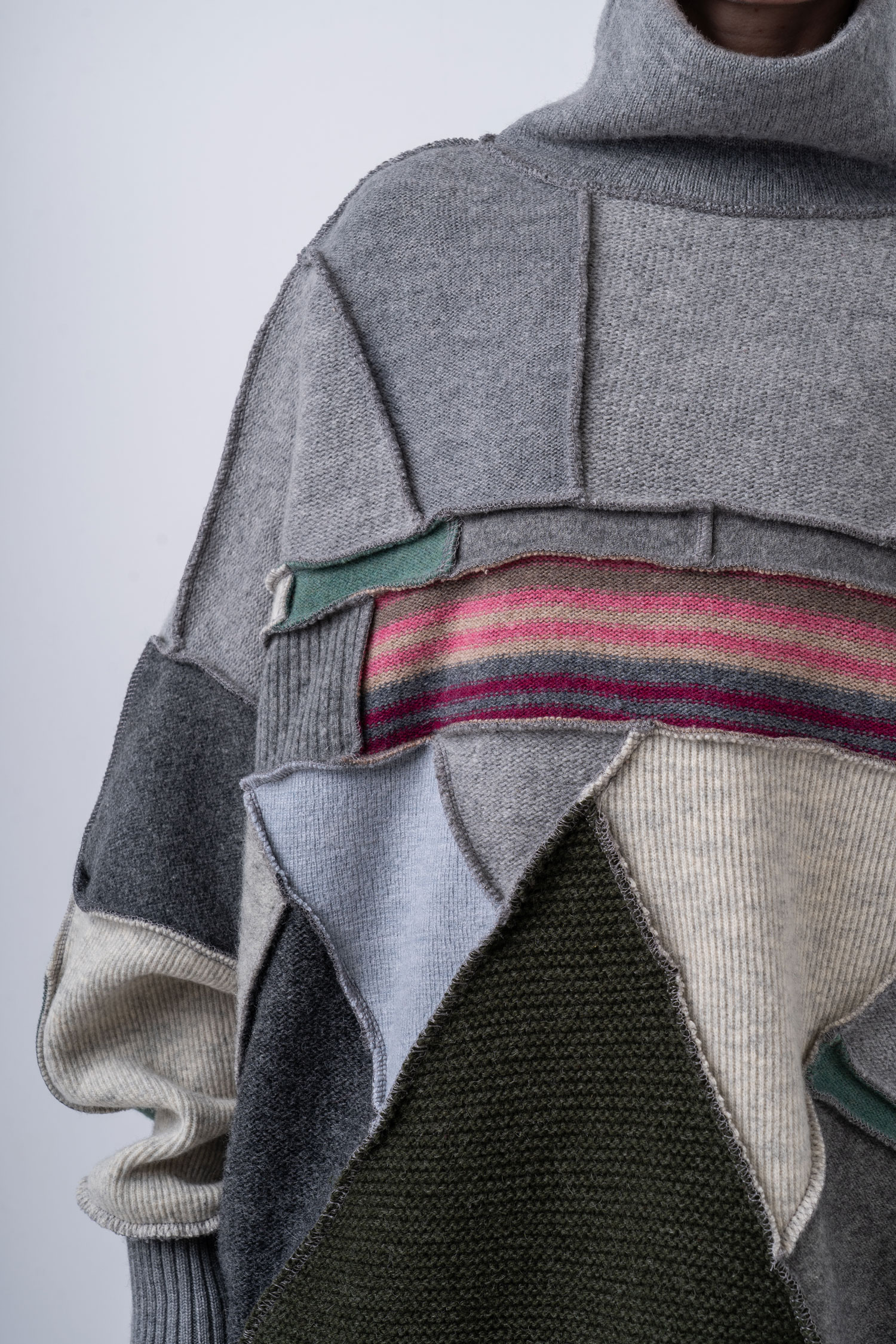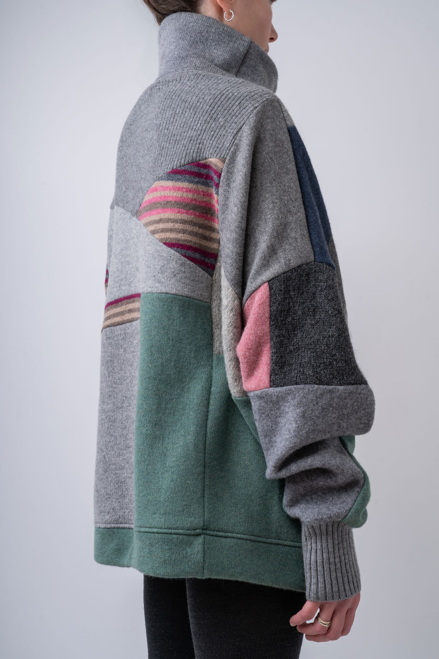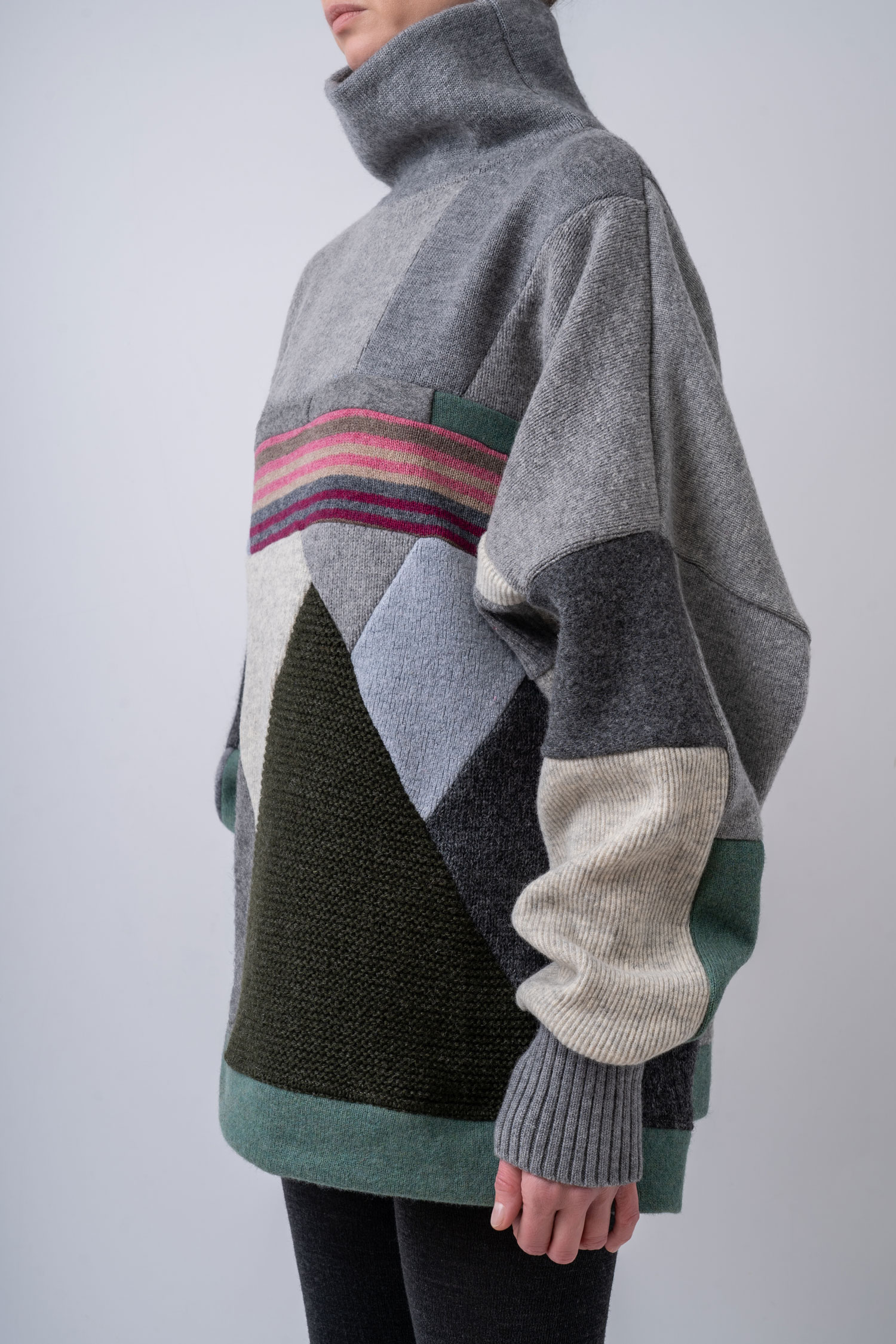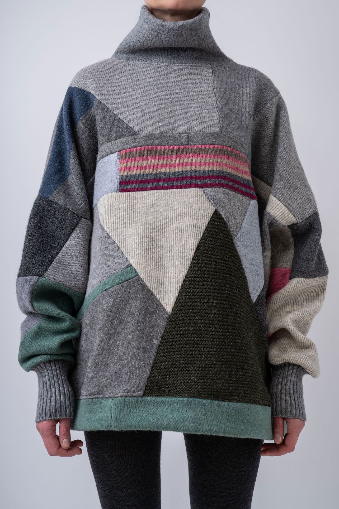 Oversizowy sweter o lekko przedłużonym kroju w odcieniach szarości zestawionej z elementami błękitu, koloru szałwii oraz różu. Produkt wykonany jest z kawałków wełnianych ubrań pochodzących z rynku wtórnego. Ten patchworkowy sweter z golfem i ultra długimi rękawami to pojedynczy, niepowtarzalny egzemplarz, zestawiony z fragmentów wełnianych materiałów o różnych strukturach i grubościach. Nietoperzowe rękawy zapewniają swobodę ruchów. Do wykonania swetra częściowo wykorzystaliśmy sfilcowane elementy wełny, co sprawia, że jest on wyjątkowo ciepły. Sweter można nosić na prawej lub na lewej stronie z wyeksponowanymi szwami. Z tego powodu metki wszyte są w taki sposób, aby można je było łatwo odciąć.