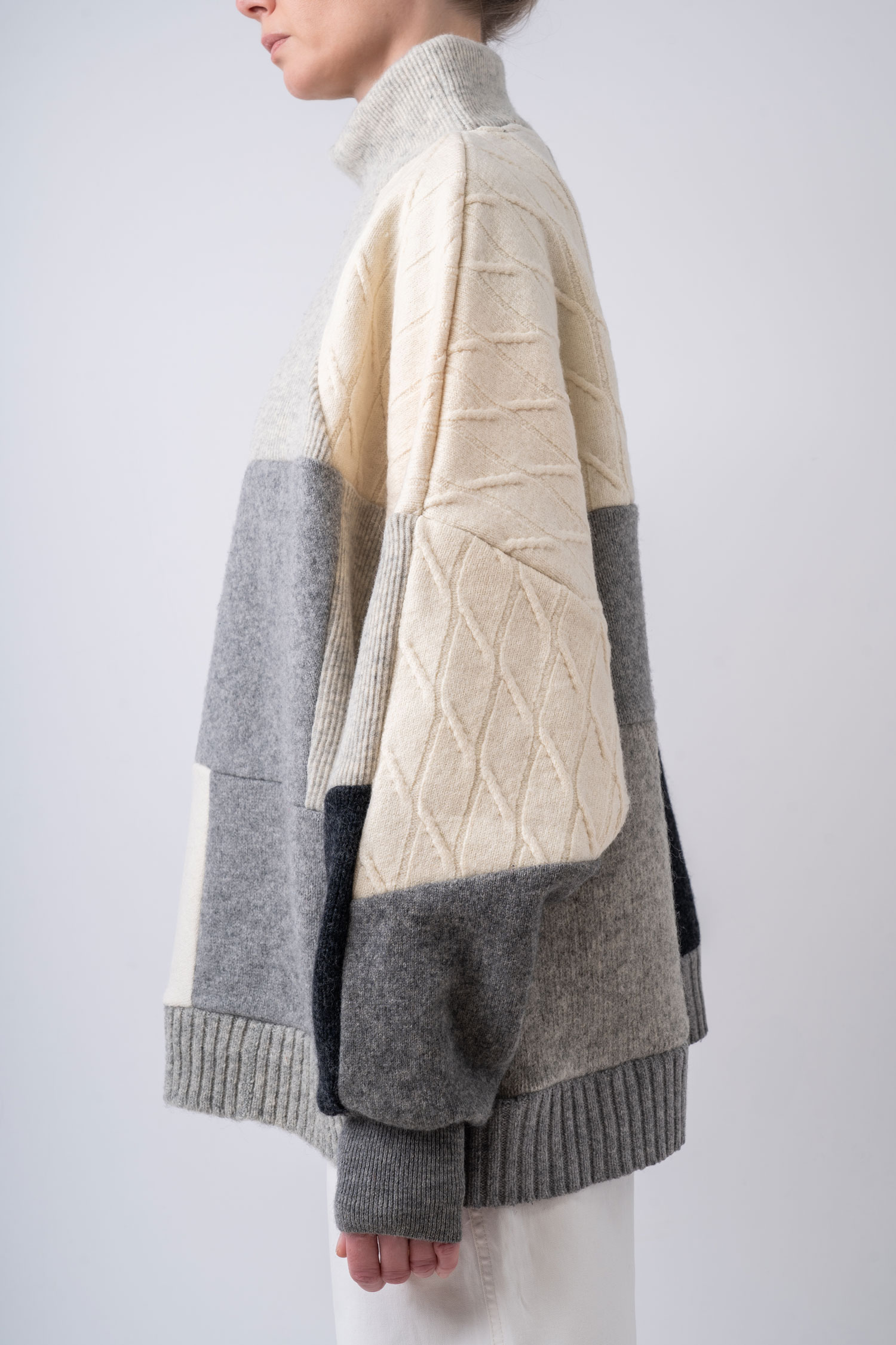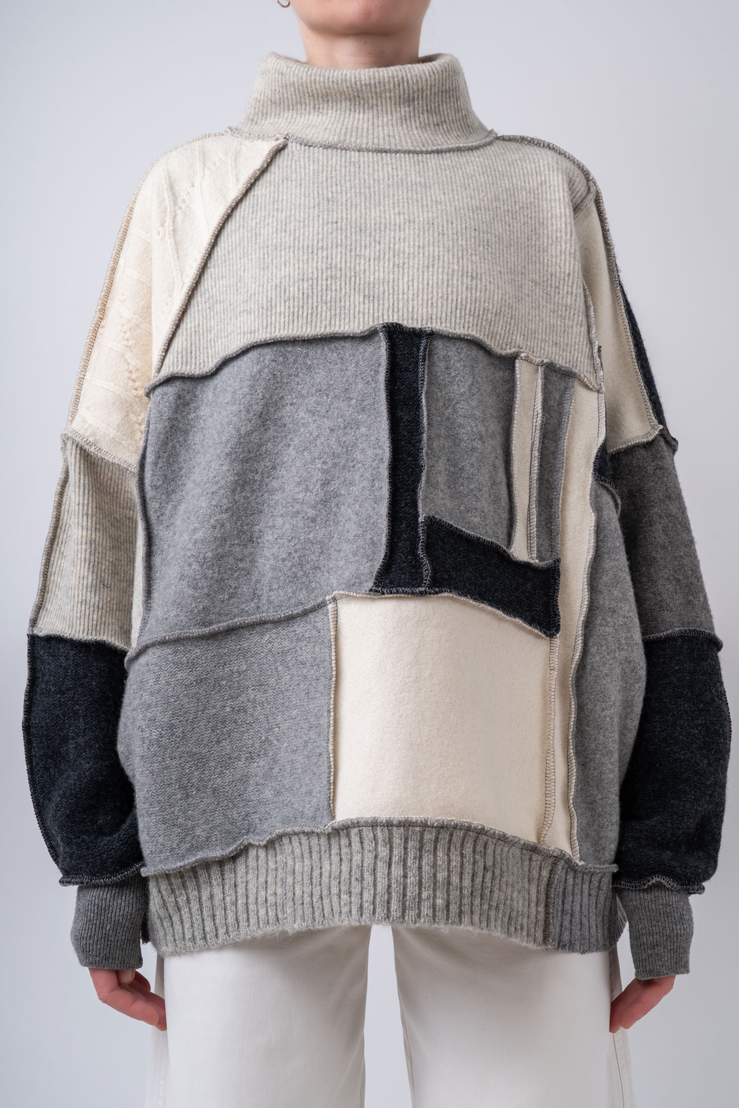 Oversizowy sweter o lekko przedłużonym kroju w odcieniach szarości, grafitu i kremowej bieli, wykonany z kawałków wełnianych ubrań z rynku wtórnego. Na plecach znajduje się motyw lisa, który dodaje mu wyjątkowego charakteru. Ten patchworkowy sweter z półgolfem to pojedynczy, niepowtarzalny egzemplarz, zestawiony z fragmentów wełnianych materiałów o różnych strukturach i grubościach. Nietoperzowe, przedłużone rękawy zapewniają swobodę ruchów. Do wykonania swetra częściowo wykorzystaliśmy sfilcowane elementy wełny, co sprawia, że jest on wyjątkowo ciepły. Sweter można nosić na prawej lub na lewej stronie z wyeksponowanymi szwami. Z tego powodu metki wszyte są w taki sposób, aby można je było łatwo odciąć.