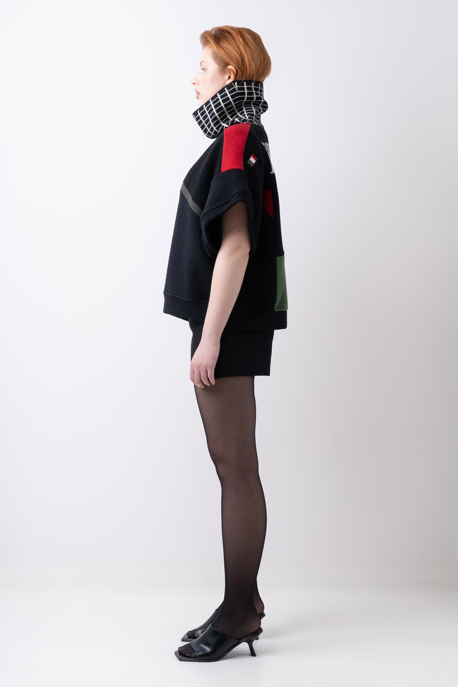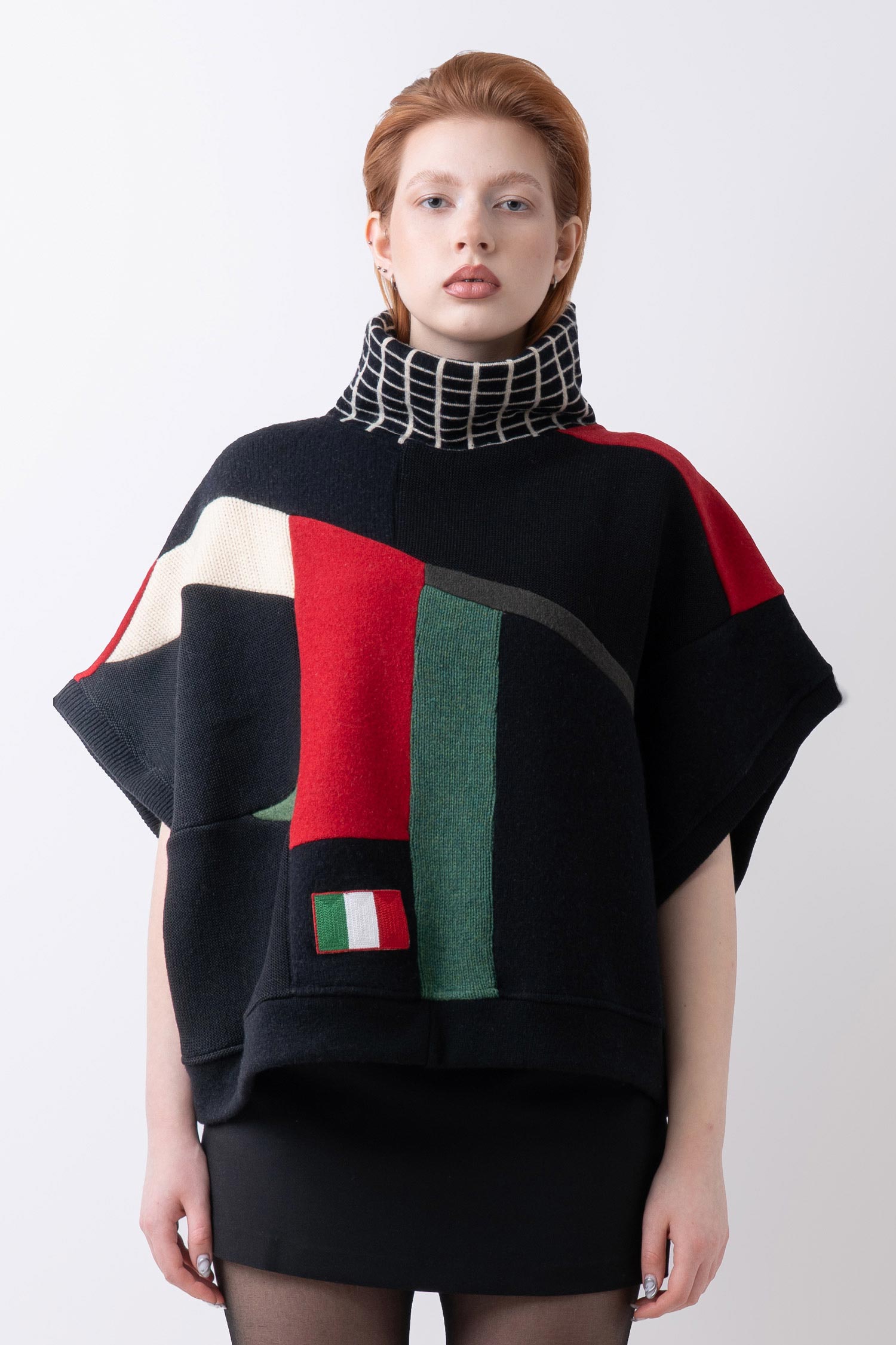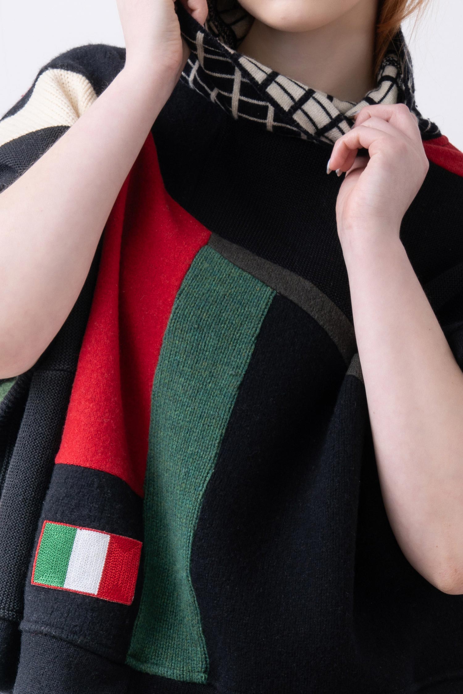 Krótka, obszerna kamizelka o nietoperzowym kroju w głębokiej czerni, z charakterystycznymi akcentami w kolorach flagi Włoch – zieleni, bieli i czerwieni, rozmieszczonymi w kilku miejscach. Na plecach znajduje się duży, kontrastowy napis ITALIA, który nadaje projektowi wyrazisty charakter. Całość dopełnia przeskalowany golf w biało-czarną kratkę. Golf można nosić na dwa sposoby – luźno opadający, odsłaniający wewnętrzną stronę w odwróconych kolorach, lub zawinięty do środka, co pozwala go skrócić.
