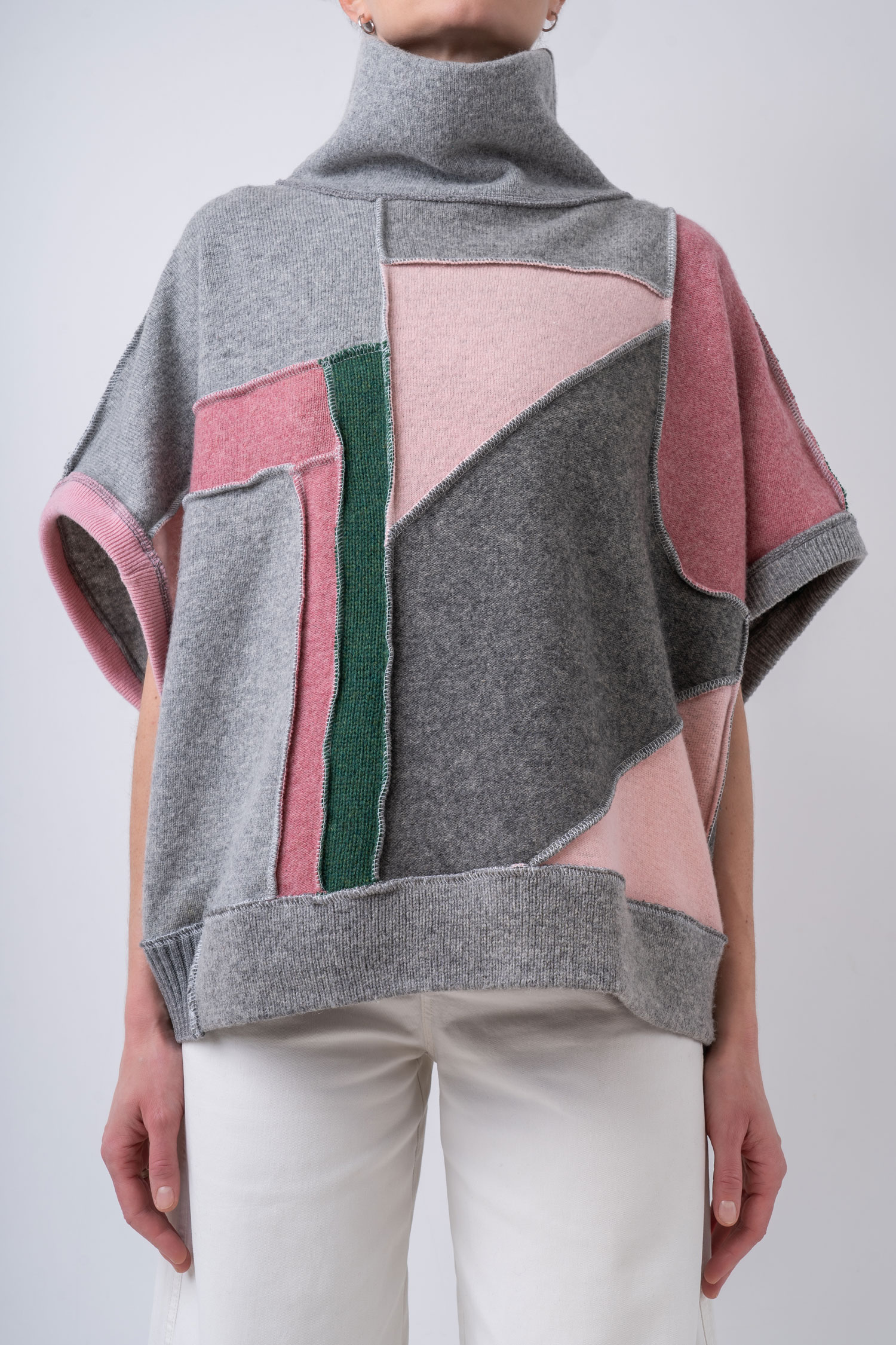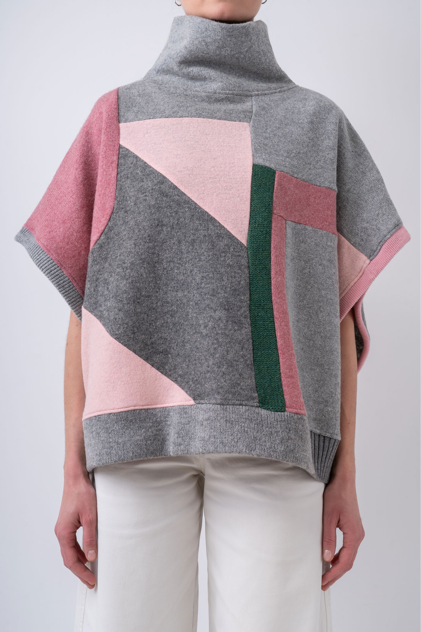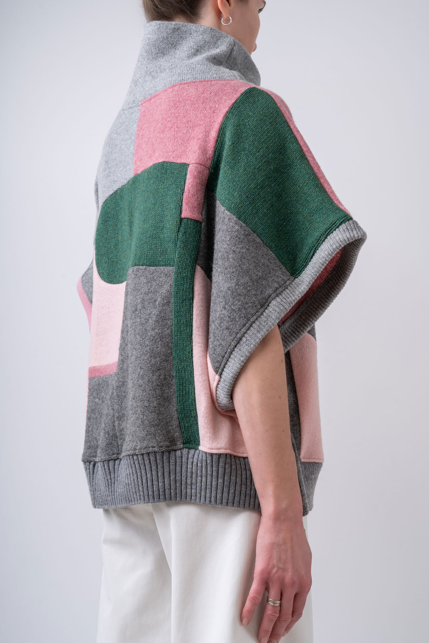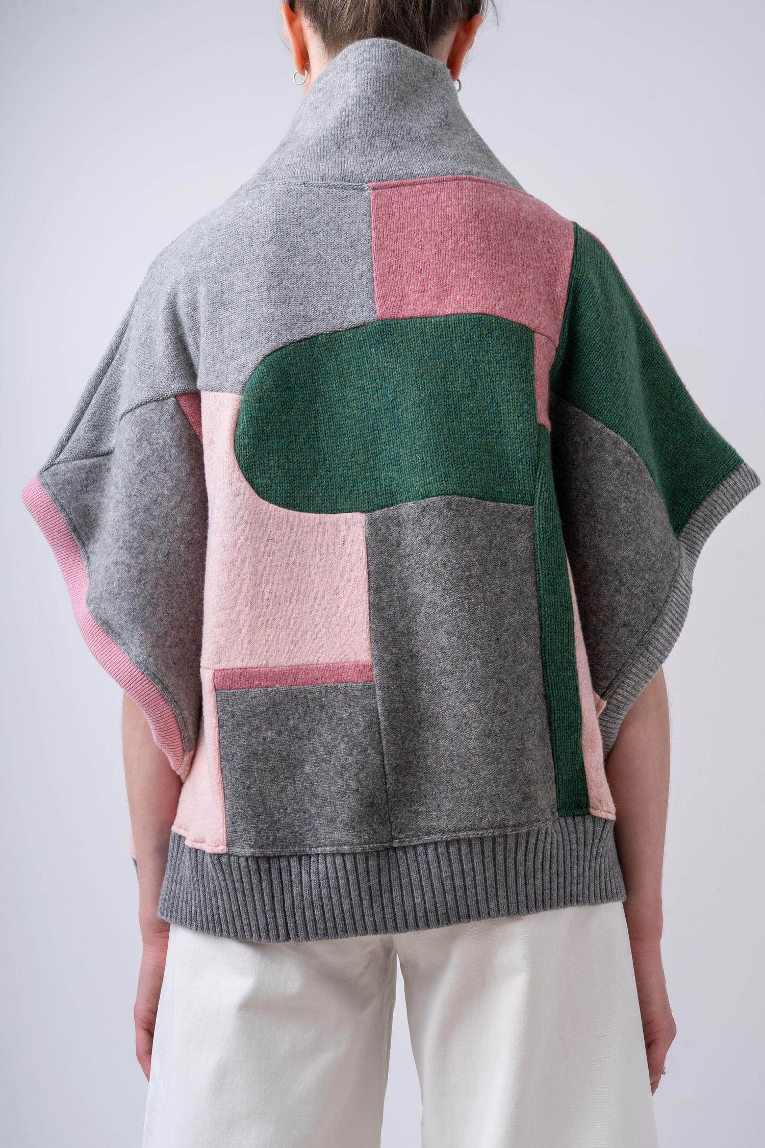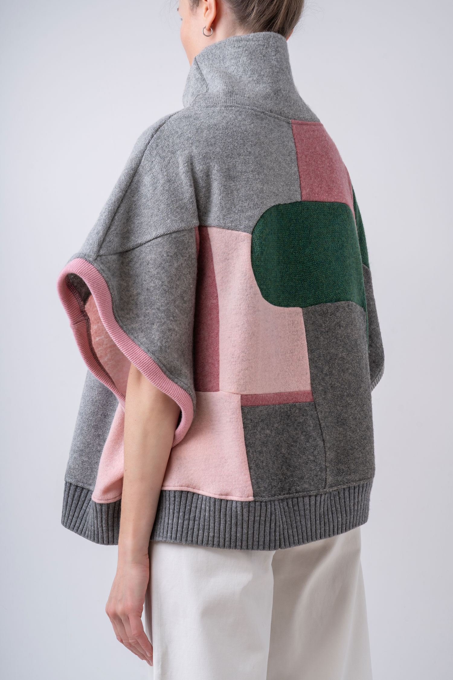 Krótsza, obszerna peleryna o nietoperzowym kroju w spokojnych tonach jasnej i średniej szarości zestawionych z odcieniami różu oraz jodłowej zieleni. Cape wykonany jest w całości z kawałków wełnianych ubrań pochodzących z rynku wtórnego. Oversizowa kamizelka doskonale sprawdzi się w warstwowych stylizacjach jesienno-zimowych, a także może być noszona samodzielnie – otwarte rękawy, subtelnie odsłaniają ciało. Ten patchworkowy cape z golfem to pojedynczy, niepowtarzalny egzemplarz, zestawiony z fragmentów wełnianych materiałów o różnych strukturach i grubościach. Do wykonania kamizelki częściowo wykorzystaliśmy sfilcowane elementy wełny, co sprawia, że jest ona wyjątkowo ciepła. Cape można nosić na prawej lub na lewej stronie z wyeksponowanymi szwami. Z tego powodu metki wszyte są w taki sposób, aby można je było łatwo odciąć.