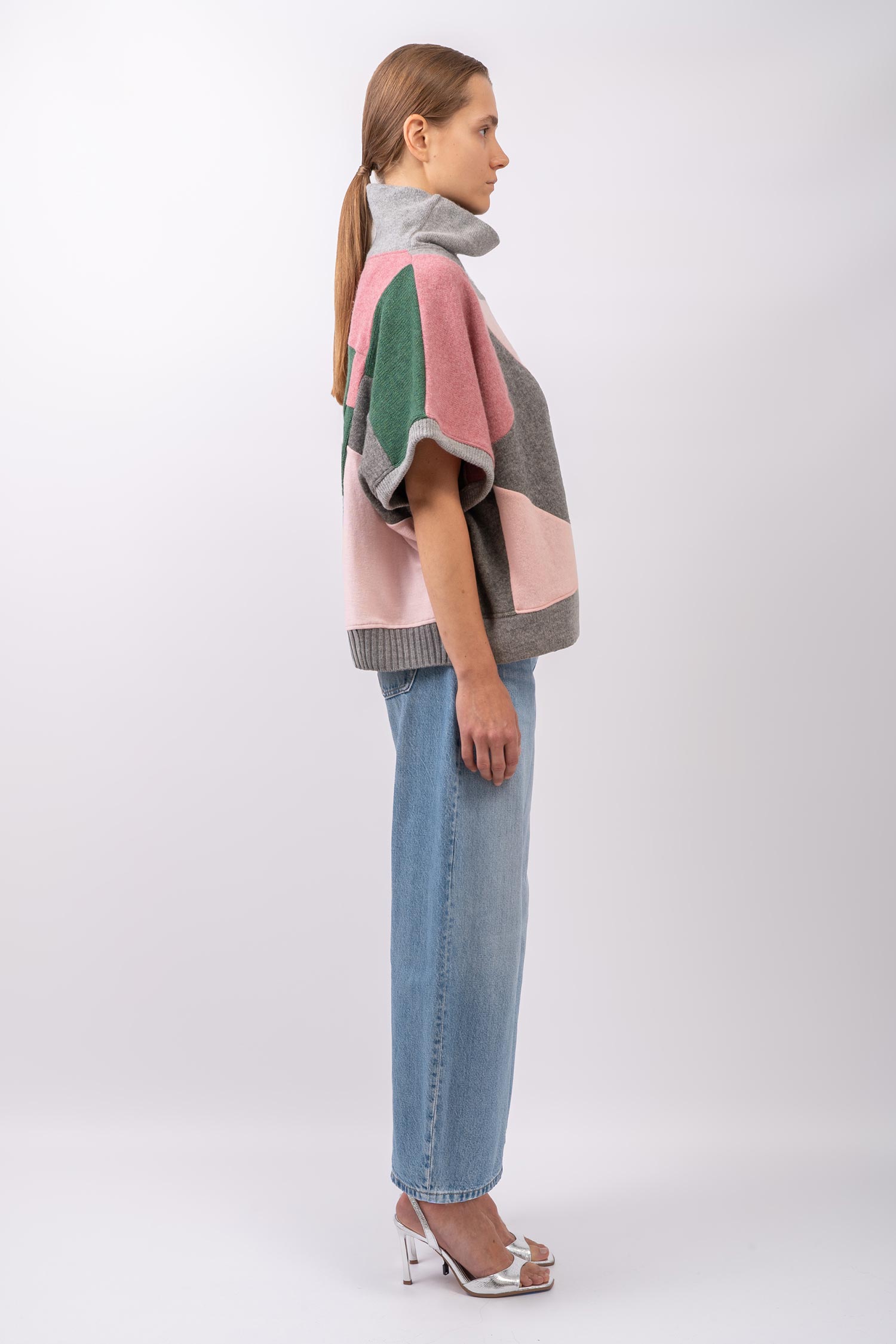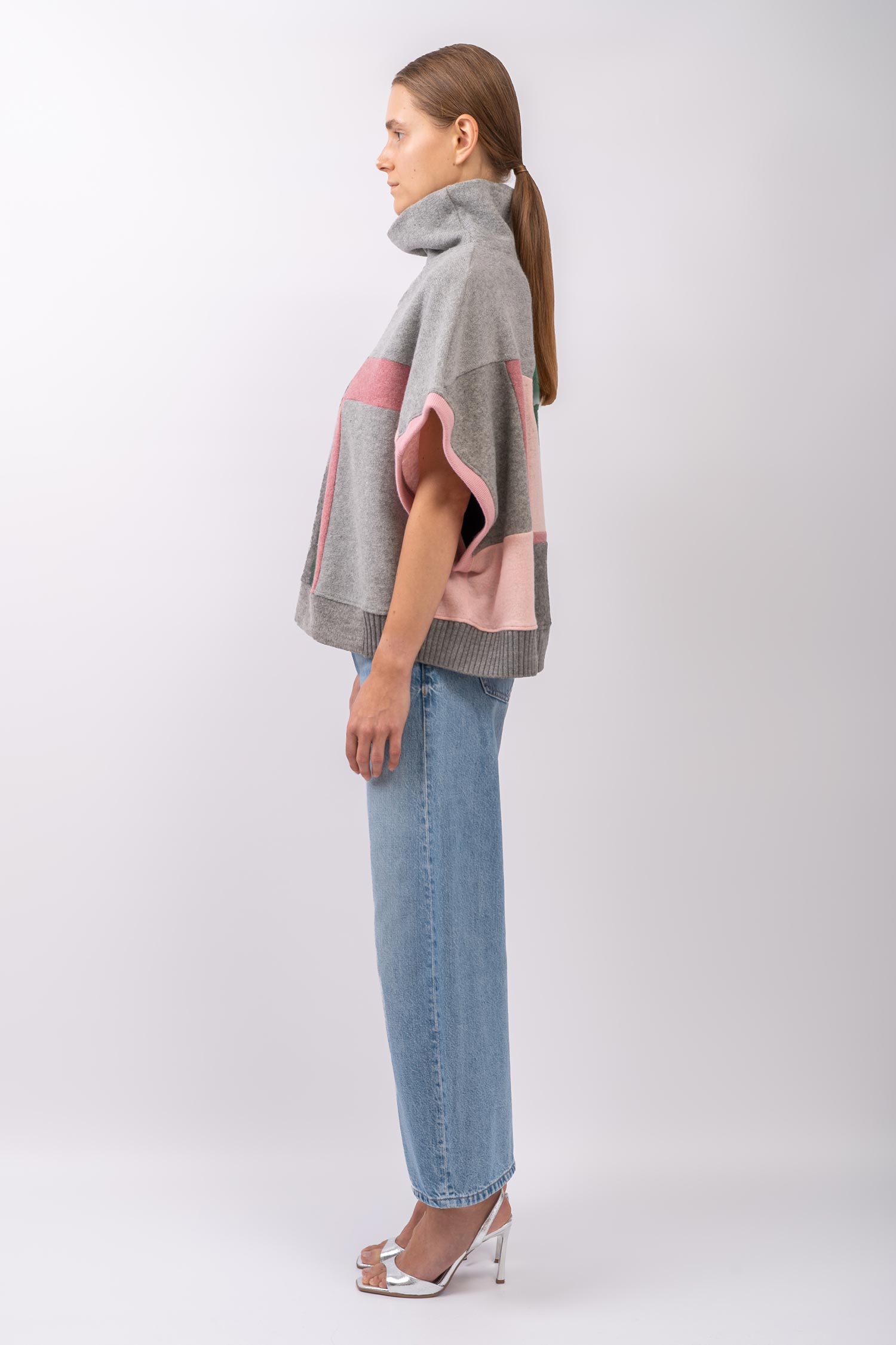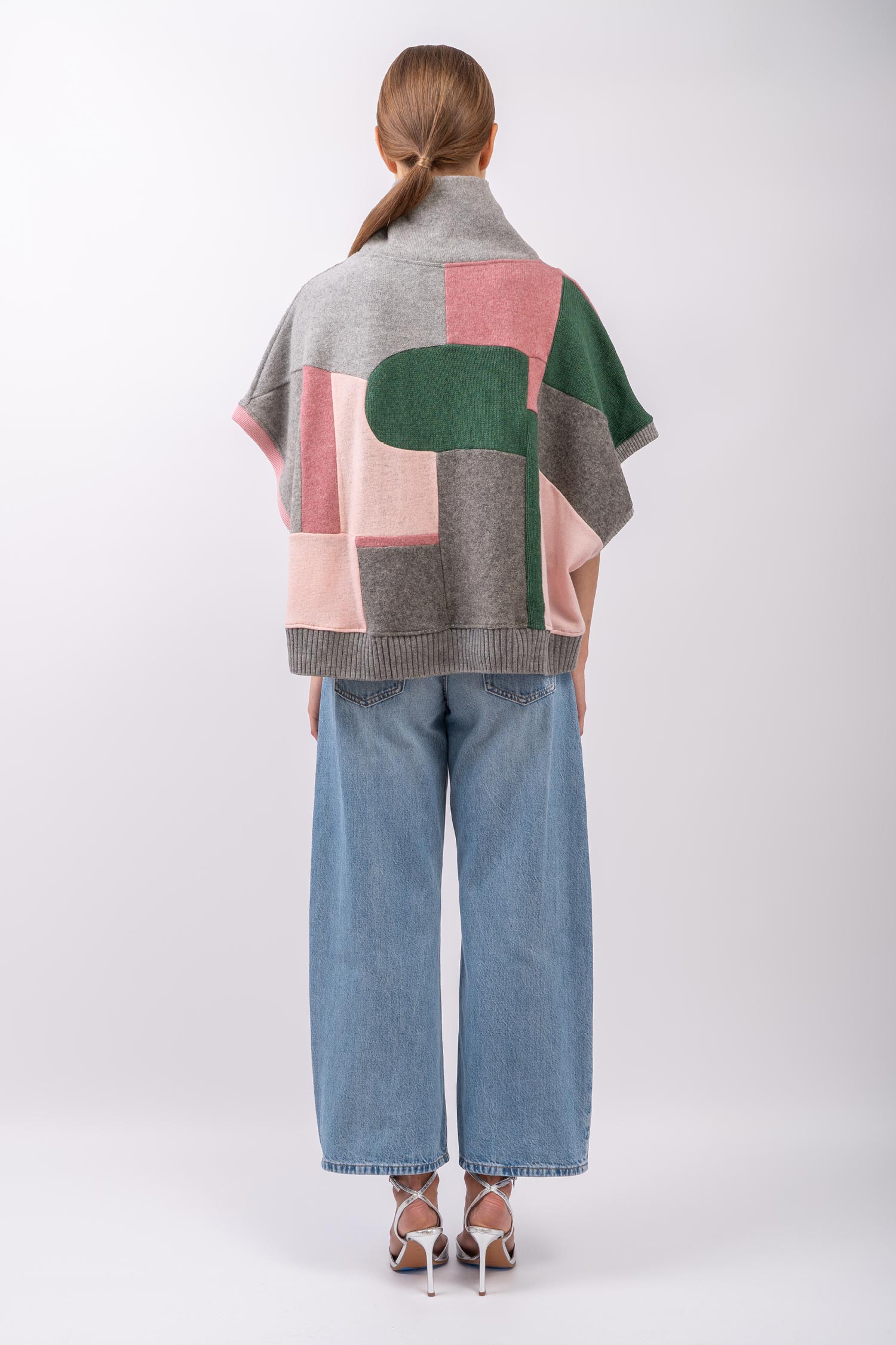 Krótsza, obszerna peleryna o nietoperzowym kroju w spokojnych tonach jasnej i średniej szarości zestawionych z odcieniami różu oraz jodłowej zieleni. Cape wykonany jest w całości z kawałków wełnianych ubrań pochodzących z rynku wtórnego. Oversizowa kamizelka doskonale sprawdzi się w warstwowych stylizacjach jesienno-zimowych, a także może być noszona samodzielnie – otwarte rękawy, subtelnie odsłaniają ciało. Ten patchworkowy cape z golfem to pojedynczy, niepowtarzalny egzemplarz, zestawiony z fragmentów wełnianych materiałów o różnych strukturach i grubościach. Do wykonania kamizelki częściowo wykorzystaliśmy sfilcowane elementy wełny, co sprawia, że jest ona wyjątkowo ciepła. Cape można nosić na prawej lub na lewej stronie z wyeksponowanymi szwami. Z tego powodu metki wszyte są w taki sposób, aby można je było łatwo odciąć.