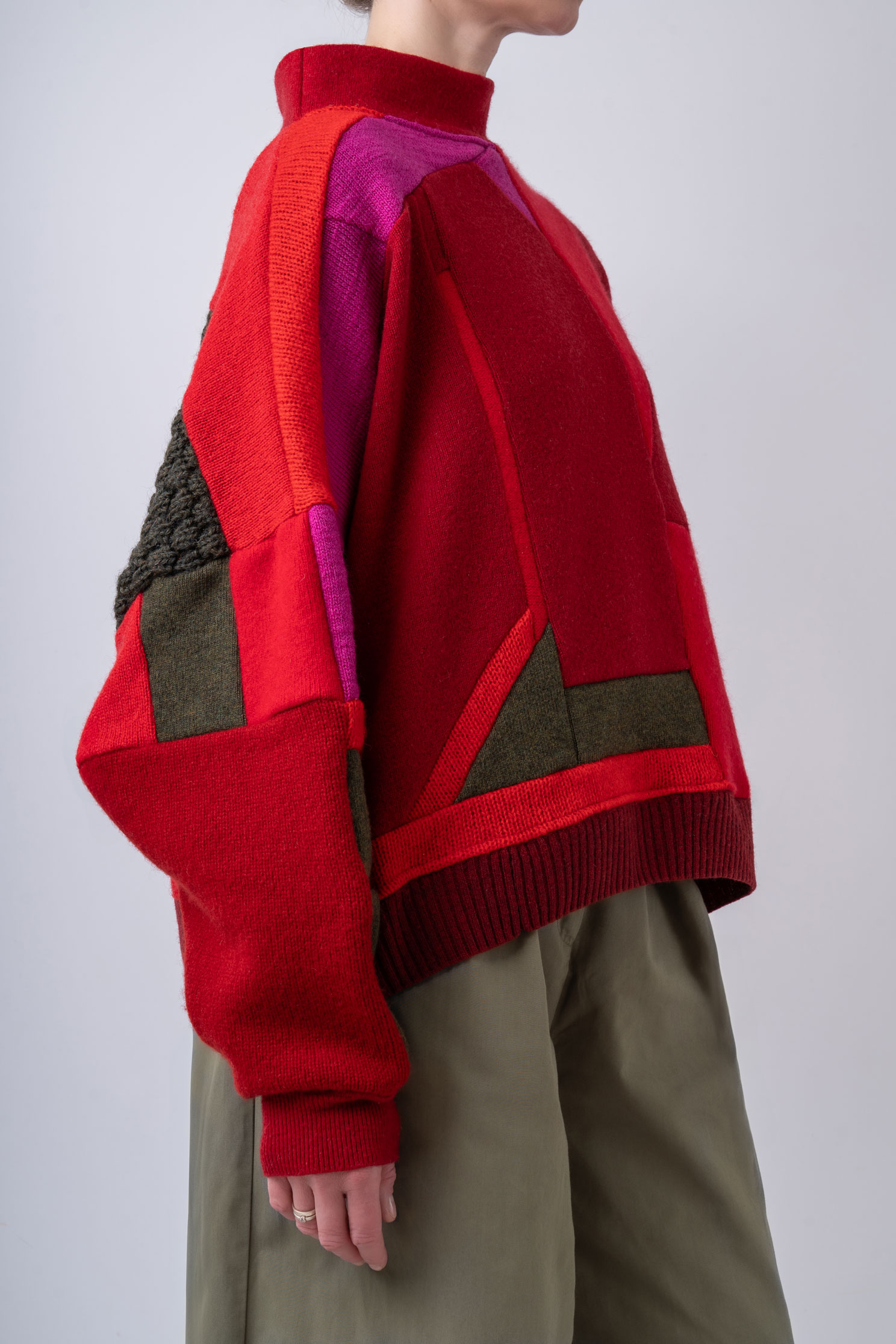 Krótszy, pudełkowy sweter w intensywnych odcieniach czerwieni i leśnej zieleni z akcentami fuksji. Wykonany w całości z kawałków wełnianych ubrań pochodzących z rynku wtórnego. Ten patchworkowy sweter z szeroką stójką to pojedynczy, niepowtarzalny egzemplarz, zestawiony z fragmentów wełnianych materiałów o różnych strukturach i grubościach. Nietoperzowe, obszerne rękawy zapewniają swobodę ruchów. Do wykonania swetra częściowo wykorzystaliśmy sfilcowane elementy wełny, co sprawia, że jest on wyjątkowo ciepły. Sweter można nosić na prawej lub na lewej stronie z wyeksponowanymi szwami. Z tego powodu metki wszyte są w taki sposób, aby można je było łatwo odciąć.
