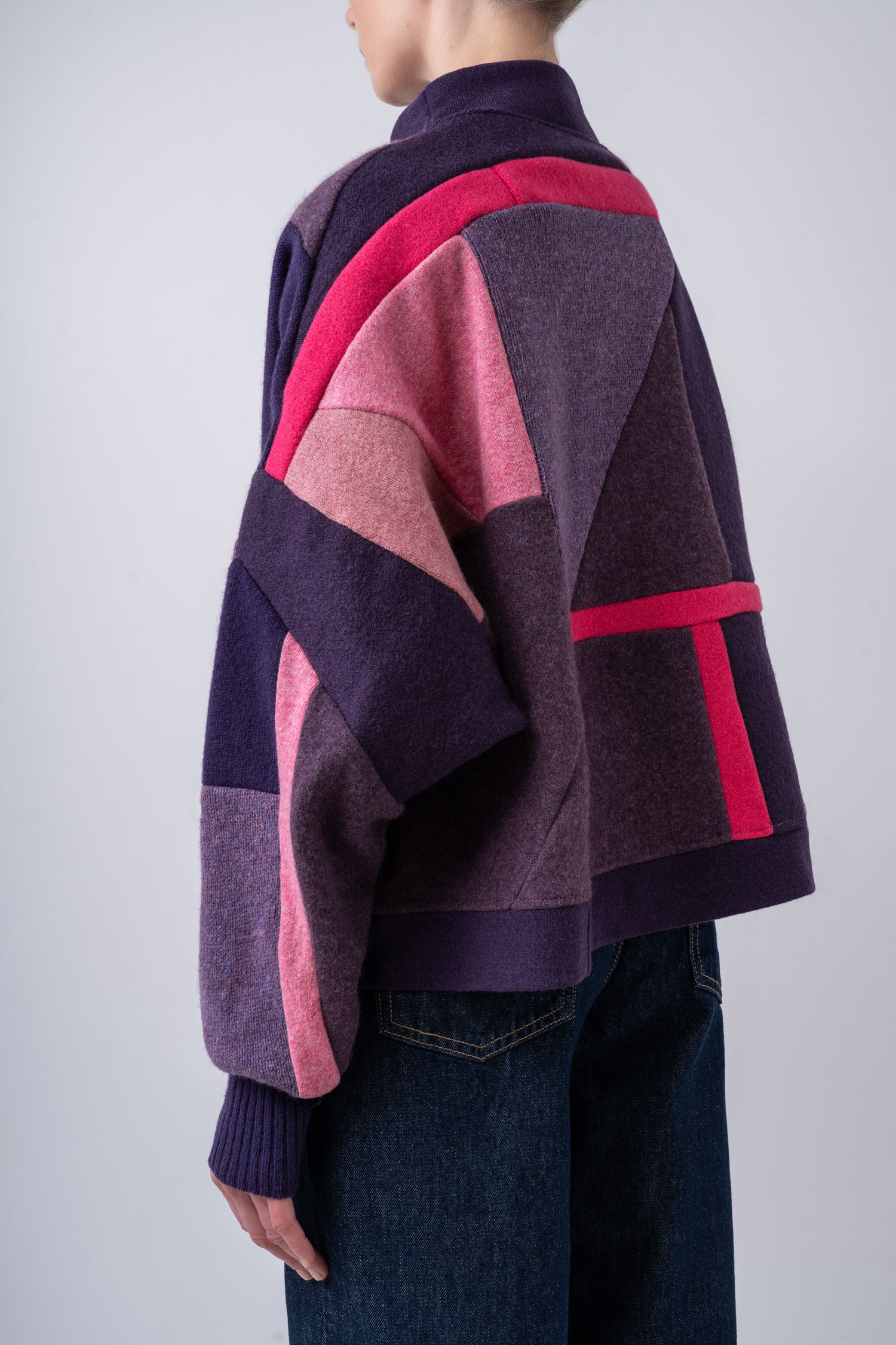 Krótszy, pudełkowy sweter w zmysłowych odcieniach fioletu przełamanych wyrazistą fuksją oraz subtelnym, zgaszonym różem. Wykonany w całości z kawałków wełnianych ubrań pochodzących z rynku wtórnego. Ten patchworkowy sweter z szerokim półgolfem to pojedynczy, niepowtarzalny egzemplarz, zestawiony z fragmentów wełnianych materiałów o różnych strukturach i grubościach. Nietoperzowe, obszerne i przedłużone rękawy zapewniają swobodę ruchów. Do wykonania swetra częściowo wykorzystaliśmy sfilcowane elementy wełny, co sprawia, że jest on wyjątkowo ciepły. Sweter można nosić na prawej lub na lewej stronie z wyeksponowanymi szwami. Z tego powodu metki wszyte są w taki sposób, aby można je było łatwo odciąć.